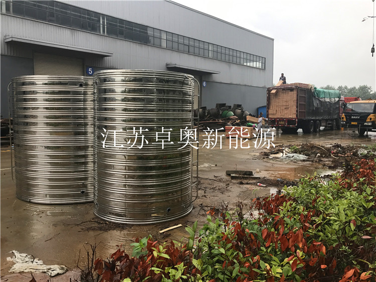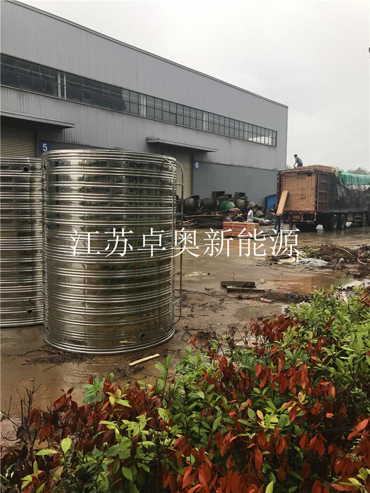 二期為一個10噸水箱,一個5噸水箱,配置了2臺10匹空氣能熱泵,30組太陽能集熱器聯箱,安裝投入使用后24小時提供熱水供應。
