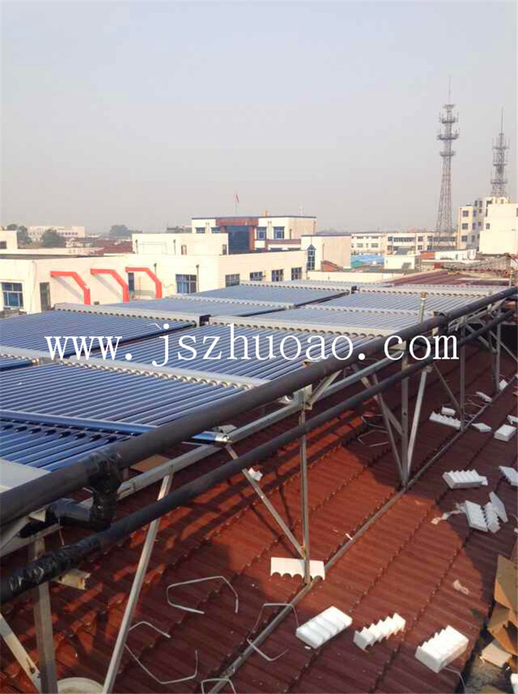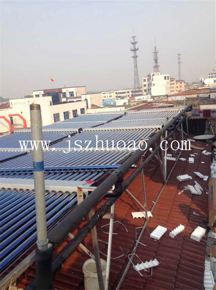 工程介紹:6組太陽能集熱模塊,1臺(tái)3噸不銹鋼保溫水箱,配置12KW電加熱進(jìn)行輔助加熱。