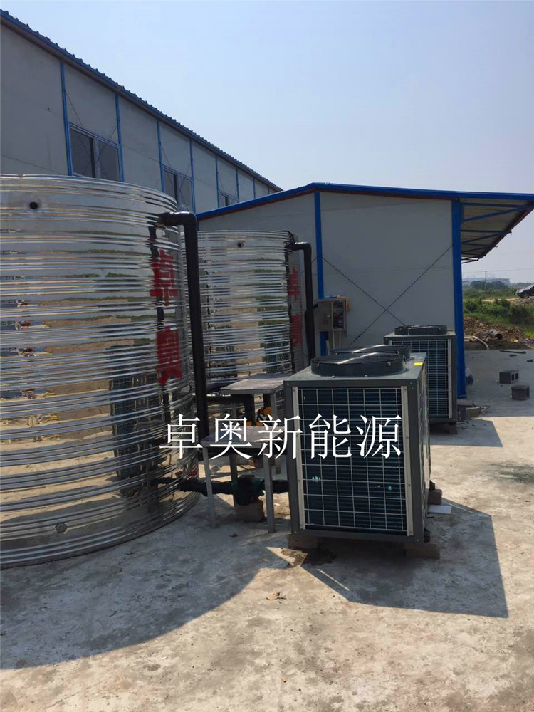 系統配置:2臺15匹商用空氣能+2個圓形不銹鋼保溫水箱